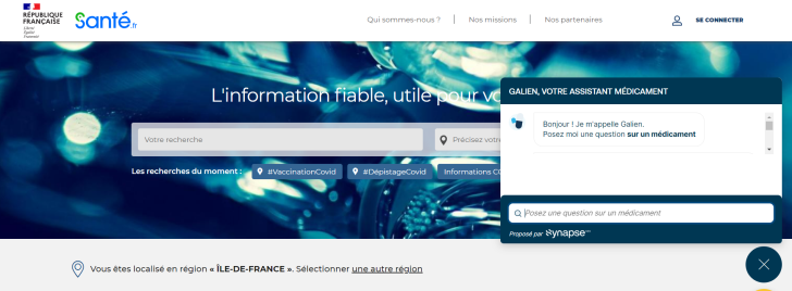 Le Service Public d’information en santé, au sein du Ministère des Solidarités et de la Santé, a implémenté “Galien”, un assistant virtuel dédié au bon usage du médicament, sur Santé.fr, le site d’information de référence pour le grand public. Cet assistant virtuel a pour mission d’apporter de l’information fiable et compréhensible par tous les français sur leurs médicaments. Les réponses sont apportées à titre d'information générale, elles ne se substituent en aucun cas à un avis médical. Développé par Synapse Medicine, Galien est basé sur des algorithmes d’intelligence artificielle : il s’améliore donc régulièrement pour affiner la compréhension des questions des utilisateurs et les réponses apportées.