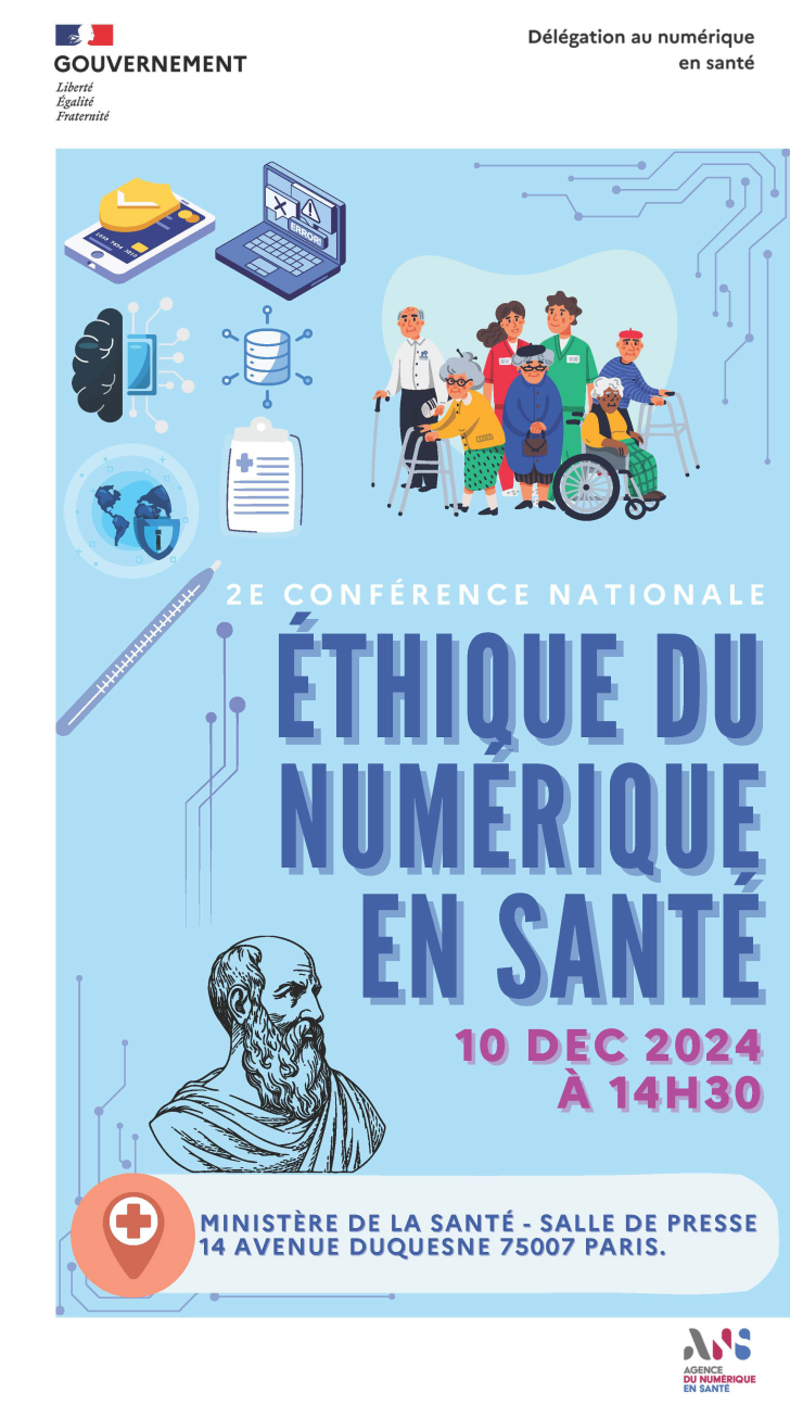 Après une première édition, la Délégation au numérique en santé (DNS) et le Ministère de la santé et de l'accès aux soins sont heureux de vous inviter à la 2e conférence nationale de l'éthique du numérique en santé le 10 décembre 2024 à 14H30 en salle de presse au Ministère de la santé et de l'accès aux soins (14 avenue Duquesne, 75007, Paris).
