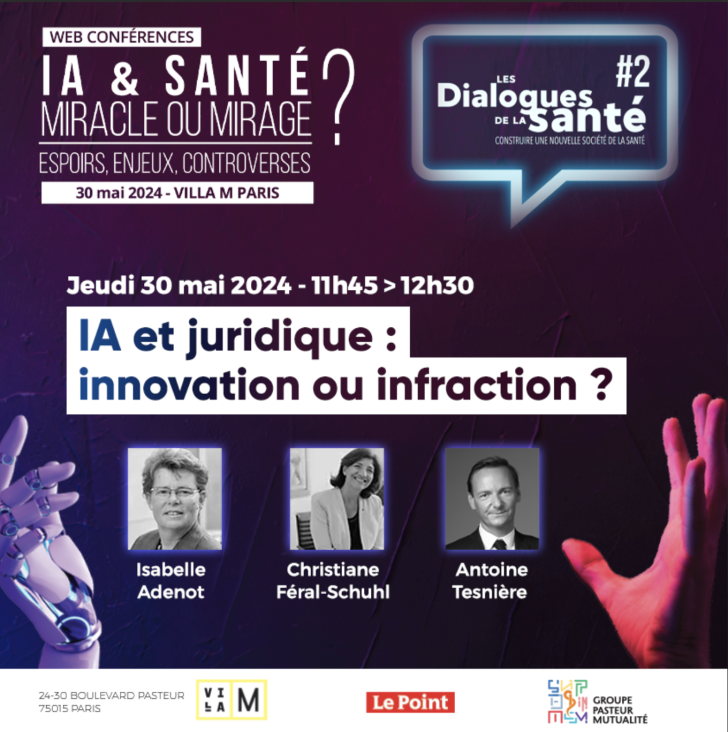 Les avancées de l'IA en santé soulèvent des défis juridiques majeurs : comment adapter nos lois sans freiner l'innovation ? Conformité, protection des données et propriété intellectuelle sont au cœur des préoccupations. Venez démêler le vrai du faux le 30 mai 2024 lors de la 2ème édition des Dialogues de la Santé ! Une journée de débats avec les plus grands experts sur le thème « IA & Santé : miracle ou mirage ? ». Un événement VillaM - Paris en partenariat avec Le Point en compagnie de :