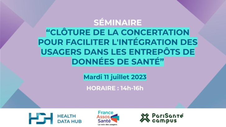 En 2022, le Health Data Hub et France Assos Santé ont lancé conjointement une concertation sur la représentation des usagers dans les comités scientifiques et éthiques des Entrepôts de Données de Santé (EDS). Pour clôturer cette concertation et présenter ses résultats et livrables, un séminaire est organisé à PariSanté Campus le 11 juillet 2023.
