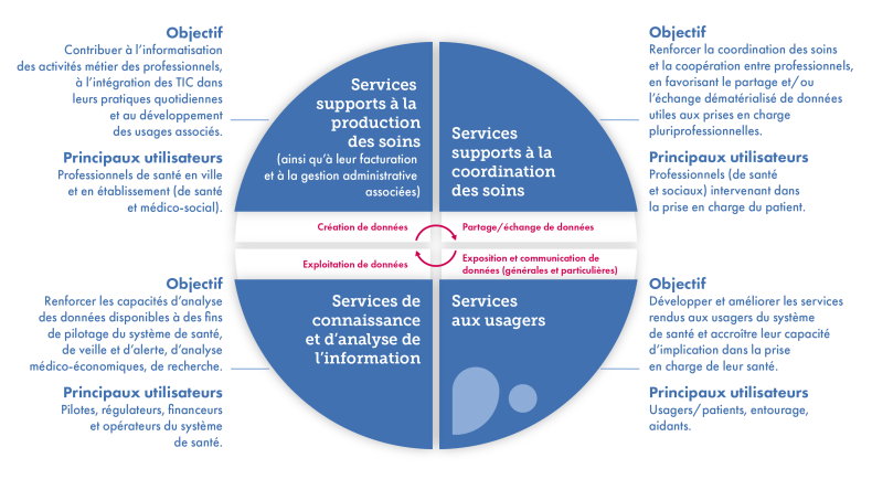 - Professionnels et structures de santé : Du côté des professionnels de santé, la prise en charge s'incarne dans l'effectuation du soin ou de l'accompagnement thérapeutique, passant par une coordination de tous les soignants, des actes médicaux assistés par le digital et un échange de données médicales fluide, alors grandement favorisés par l’implantation du numérique au sein des structures et auprès des personnes.