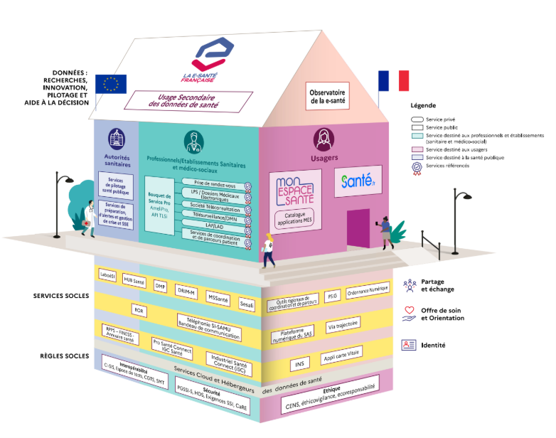 La doctrine du numérique en santé a pour objectif d’accélérer le développement du numérique en santé et d’engager les acteurs privés et publics à développer des solutions numériques innovantes et utiles aux usagers et aux professionnels. Dans ce cadre, elle doit fournir à l’ensemble des acteurs du numérique en santé un cadre d’urbanisation réparti comme suit et matérialisé par la Maison de la e-santé ci-dessous.