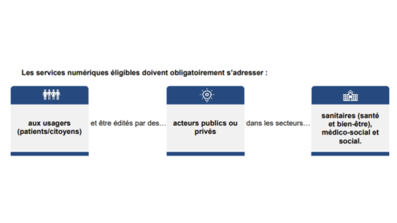 Dans une approche inclusive, tous les services numériques à destination des citoyens, utiles à la prise en charge de sa santé, peuvent candidater au référencement. Les services numériques éligibles doivent s’adresser aux usagers (patients/citoyens) et être édités par des acteurs publics ou privés, dans les secteurs sanitaires (santé et bien-être), médico-social et social. Ils doivent entrer dans le périmètre défini par l’article L. 1111-13-1 précité.