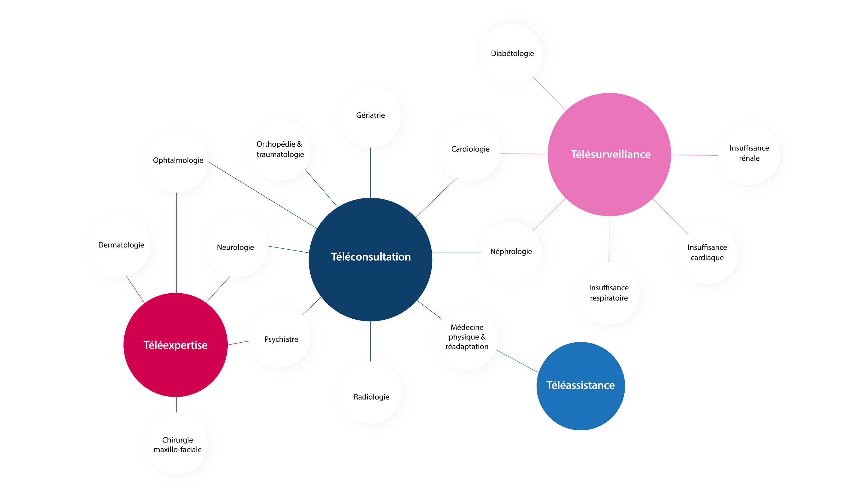 L’ANS a conduit un état des lieux de la télémédecine en France, dans lequel 14 cas d’usages ont pu être établis, représentants 11 spécialités de médecine. Il s’agit de :