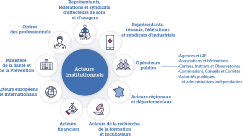 Agence du Numérique en Santé (ANS), Agence Nationale d'Appui à la Performance (ANAP), Agence nationale de l'habitat (Anah), Agence Nationale de Sécurité du Médicament et des produits de santé (ANSM), Santé Publique France, Agence Technique de l’Information sur l’Hospitalisation (ATIH), Agence de la Biomédecine (ABM), Agence Nationale de la Sécurité des Systèmes d’Information (ANSSI), Agence Générale des Equipements et Produits de Santé (AGEPS), Agence nationale de sécurité sanitaire de l’alimentation, de l’environnement et du travail (Anses), Health data Hub, GIE SESAM-Vitale...